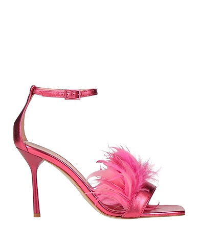 ankle strap sandals, leather, metallic, feathers, plain colour with appliqués, leather lining, buckle-fastening ankle strap, square toe, spike heel, rubber cleated sole, contains non-textile parts of animal origin