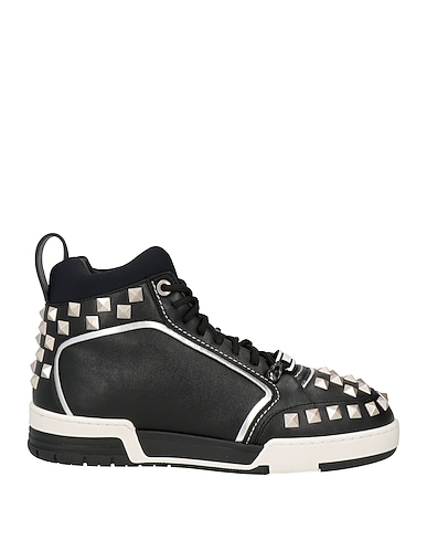 leather, brand logo, studs, plain colour with appliqués, leather lining, lace-up, round toe, flat, rubber cleated sole, contains non-textile parts of animal origin, high-top trainers, large sized