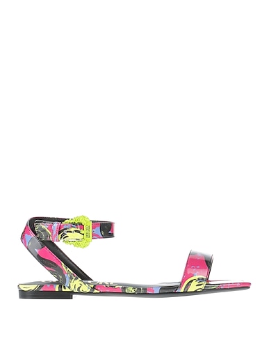 coated fabric, patent-effect, brand logo, signature print, fully lined, buckle-fastening ankle strap, square toe, flat, rubber sole, ankle strap sandals