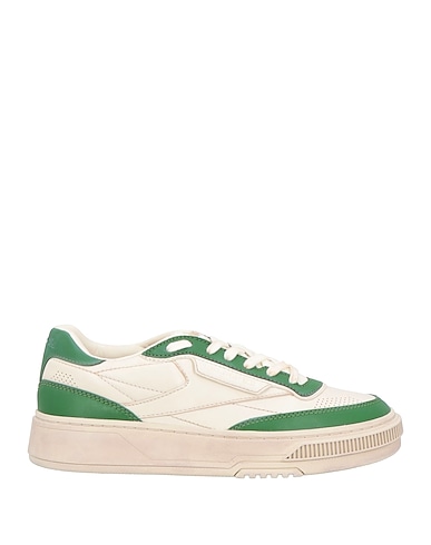 low-top trainers, leather, two-tone, brand logo, fabric inner, lace-up, round toe, rubber cleated sole, contains non-textile parts of animal origin
