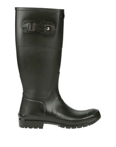 rain boots, rubber, plain colour, buckle, brand logo, fully lined, round toe, flat, rubber cleated sole