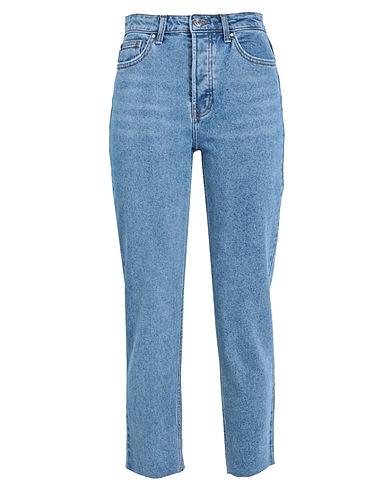 denim, faded, brand logo, plain colour, medium wash, high waisted, belt loops, straight leg, slim-leg pants, button closing, raw-cut hem, five pockets, contains non-textile parts of animal origin, straight-leg model