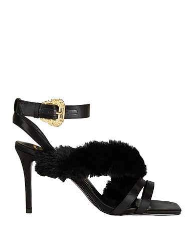 ankle strap sandals, satin, plain colour with appliqués, plush trims, fully lined, buckle-fastening ankle strap, square toe, stiletto heel, rubber sole