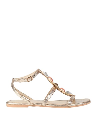 gladiator sandals, leather, metallic, plain colour with appliqués, embellished, leather lining, buckle-fastening ankle strap, round toe, flat, rubber sole, contains non-textile parts of animal origin