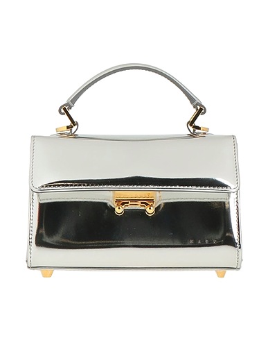 flap bag, glossed-leather, metallic, plain colour, brand logo, metal applications, framed closure, fully lined, bag handle, detachable shoulder strap, feet at base, small size, contains non-textile parts of animal origin