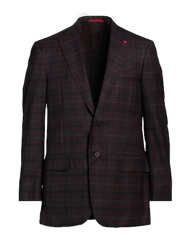 cool wool, brooch, tartan pattern, lapel collar, long sleeves, fully lined, button fastenings, multipockets, dual back vents, dry clean, do not bleach, do not tumble dry, single-breasted blazer