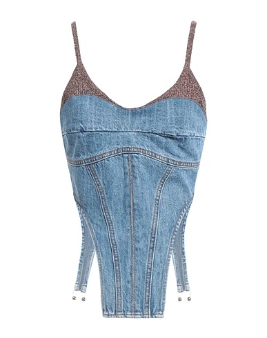 Denim, Handgestrickt, Melangestrick-Effekt, Leichter Strick, Metallapplikationen, zweifarbiger Print, Herzausschnitt, ärmellos, ungefüttert, Reißverschluss, ohne Taschen, Chemische Reinigung, Trockner ungeeignet, nicht Bleichen, Korsett