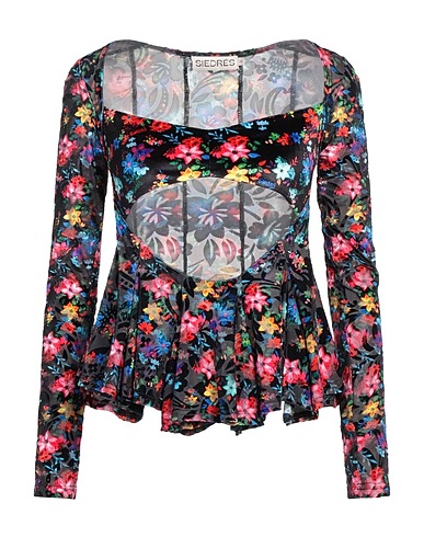 Peplum-Top, Chenille, Blumenmuster, Brand Logo, Mit Cut-outs, quadratischer Ausschnitt, lange Ärmel, Stretch, nicht mit Wasser waschen, Trockner ungeeignet
