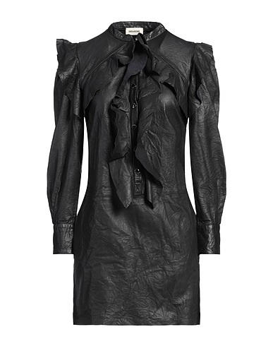 A-Linien-Kleid, Spaltleder, einfarbig, Rüschen, chinesischer Kragen, lange Ärmel, Manschetten mit Druckknöpfen, ungefüttert, Verschluss mit Druckknöpfen, Ohne Taschen, Enthält nichttextile Teile tierischen Ursprungs., Nicht chemisch reinigen, nicht Bleichen, Trockner ungeeignet, nicht bügeln
