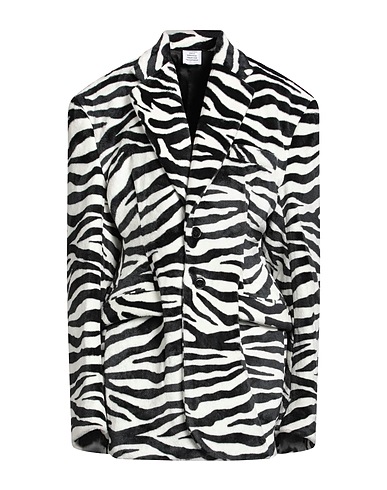 Kunstpelz, ohne Applikationen, Zebramuster, Reverskragen, Einreiher, lange Ärmel, gefüttert, Knopfverschluss, viele Taschen, Zwei Öffnungen hinten, Maschinenwäsche oder Reinigung, Trockner geeignet, nicht Bleichen, Einreiher