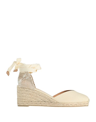 Canvas, ohne Applikationen, zweifarbiger Print, Innenfutter aus Stoff, Sandalen zum Binden, runde Spitze, Keilabsatz, in Bast eingefasster Keilabsatz, flexible Gummisohle