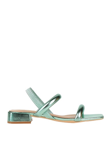 Sandalen mit knöchelriemchen, Leder, Lamé-Look, ohne Applikationen, einfarbig, Rückseite aus Leder, quadratische Spitze, ohne Absatz, Gummisohle, Enthält nichttextile Teile tierischen Ursprungs.