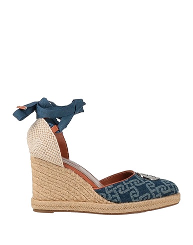 Espadrilles, Denim, Logomuster, Metallapplikationen, runde Spitze, Keilform, Gummisohle, Innenfutter aus Leder, Enthält nichttextile Teile tierischen Ursprungs.