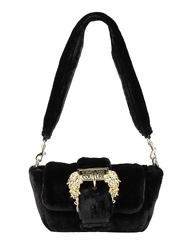 Tasche mit Patte, Plüschmaterial, Einfarbig mit Applikationen, Brand Logo, Schnalle, Magnetverschluss, Taschenhenkel, abnehmbarer Schultergurt, Modell Klein