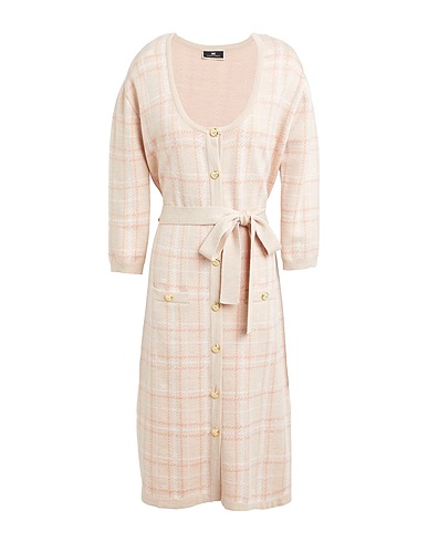 knitted, lightweight knit, belt, brand logo, tartan pattern, wide neckline, 3/4 length sleeves, unlined, button closing, multipockets