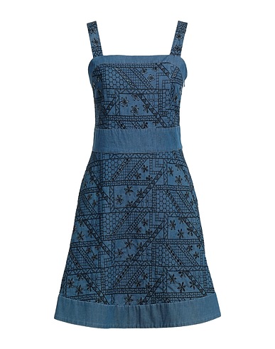 denim, brand logo, embroidered detailing, plain colour, square neckline, sleeveless, fully lined, zipper closure, snap buttons fastening, stretch, trapeze style