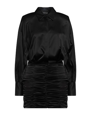 satin, draped, plain colour, classic collar, long sleeves, buttoned cuffs, partially lined interior, button fastenings, no pockets, stretch, dress