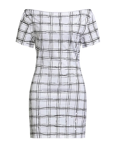 bodycon dress, jersey, checked, brand logo, boat neckline, short sleeves, unlined, raw-cut hem, machine wash or dry clean, do not bleach, do not tumble dry