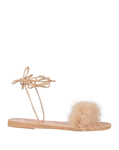 sandals, leather, plain colour, feathers, leather lining, ties at ankle, round toe, flat, leather/rubber sole, handmade, contains non-textile parts of animal origin