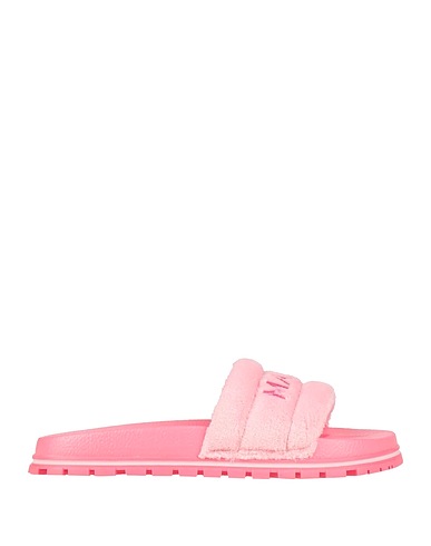 plush fabric, brand logo, plain colour, rubber lining, round toe, flat, rubber cleated sole, slide sandals, large sized