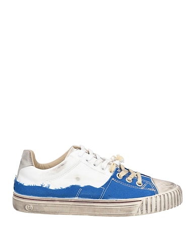 low-top trainers, leather, canvas, distressed, two-tone, brand logo, leather lining, lace-up, round toe, rubber cleated sole, contains non-textile parts of animal origin