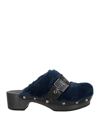 clogs, plush fabric, plain colour with appliqués, leather trims, brand logo, fully lined, round toe, square heel, rubber sole, contains non-textile parts of animal origin