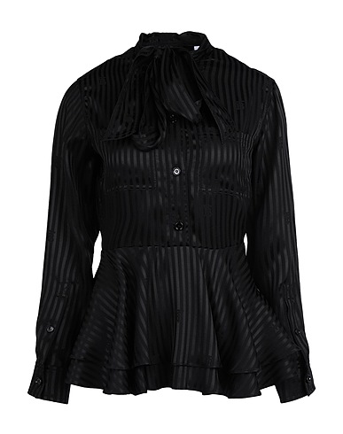 raso, de volantes, estampado a rayas, escote con lazada, manga larga, puños con botones, cierre con botones, cierre con cremallera, bolsillito doble , top con peplo