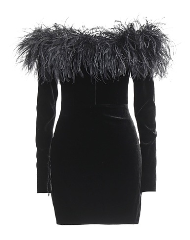 vestido ajustado, terciopelo, liso con aplicaciones, plumas, hombros descubiertos, manga larga, interior con varillas de refuerzo, cierre con corchetes, cierre con cremallera, tejido elástico, composición con partes de origen animal pero no textil, limpiar en seco, no lavar con lejía , no secar en secadora