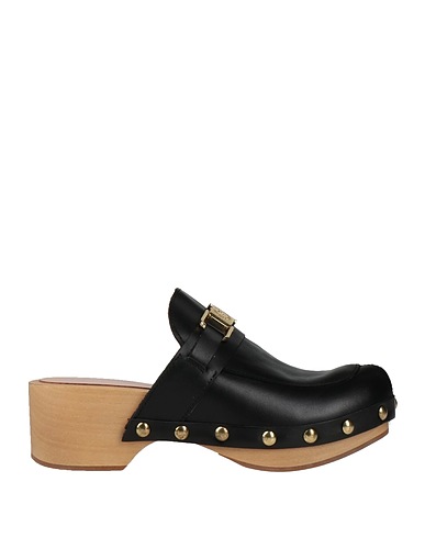 cuero, aplicaciones de metal, logotipo de la marca, liso con aplicaciones, interior sin forro, puntera redonda, tacón cuadrado, suela de goma, composición con partes de origen animal pero no textil, zuecos