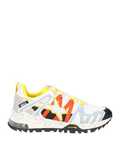 sneakers, cuero, tela técnica, estampado multicolor, logotipo de la marca, interior en tejido técnico, cierre con cordones, puntera redonda, suela de goma grabada, composición con partes de origen animal pero no textil