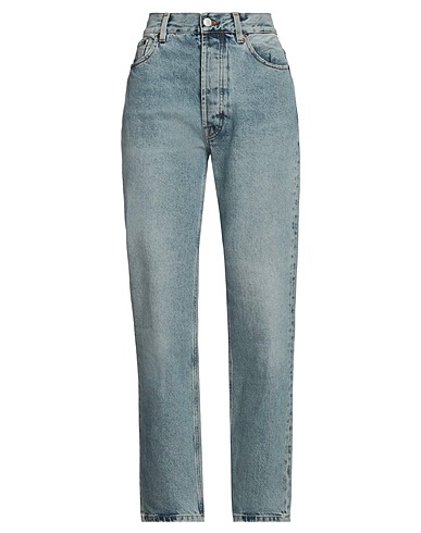 algodón denim, efecto desgastado, logotipo de la marca, monocolor, lavado medio, cintura alta, cierre con botones, cinco bolsillos, modelo con pernera recta