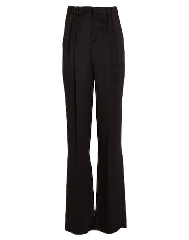 straight-leg trousers, satin, plain colour, darts, high waisted, belt loops, regular fit, zip fastening, hook fastenings, raw-cut hem, slit pockets, welt pockets, dry clean, do not bleach, do not tumble dry, contains non-textile parts of animal origin, this brand runs small