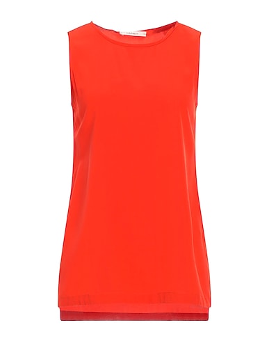 top, crêpe, uni, sans applications, col rond, sans manches, bas avec fentes latérales, ne pas laver à l'eau, ne pas sécher en machine