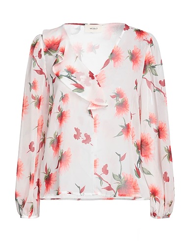 top, mousseline, fantaisie fleurie, ruchés, lavage moyen, col en v, manches longues