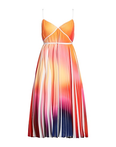 crêpe, sans applications, imprimé multicolore, col en v, sans manches, fermeture à glissière, fermeture à agrafes, sans poches, nettoyage à sec, ne pas utiliser de javel, ne pas sécher en machine, ne pas repasser, robe évasée