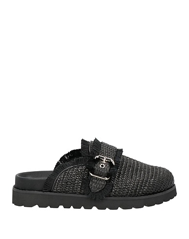sabots, raphia synthétique, uni, à franges, fermeture à boucle, pointe arrondie, sans talons, semelle en caoutchouc avec gravures, intérieur en cuir, contient des parties non textiles d’origine animale