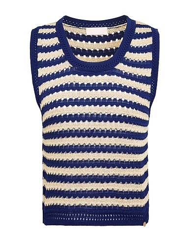 πλεκτό, μεταλλική εμφάνιση, μπλούζα από ελαφρύ νήμα, ρίγες, λογότυπο του brand, στρογγυλή λαιμόκοψη, αμάνικο, πλύσιμο στο χέρι ή στεγνό καθάρισμα, απαγορεύεται το χλώριο, απαγορεύεται το στέγνωμα σε στεγνωτήριο