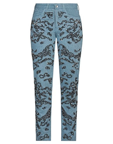 βαμβακερό denim, διακοσμητικές παγιέτες, μονόχρωμο με απλικέ στοιχεία, δίχρωμη φαντασία, μέτρια απόχρωση, ψηλόμεσο, θηλύκια ζώνης, σε ίσια γραμμή, κανονική εφαρμογή, κλείσιμο με φερμουάρ, 1 κουμπί, πέντε τσέπες, μοντέλο με ίσιο μπατζάκι, μεγάλου μεγέθους