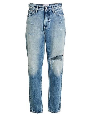 τζιν mom, βαμβακερό denim, φθαρμένη εμφάνιση, εφέ ξεβαμμένου, μονόχρωμο, λογότυπο του brand, μέτρια απόχρωση, ψηλόμεσο, θηλύκια ζώνης, κανονική εφαρμογή, κλείσιμο με φερμουάρ, 1 κουμπί, πολλαπλές τσέπες, πλύσιμο στο πλυντήριο ή στεγνό καθάρισμα, απαγορεύεται το χλώριο, απαγορεύεται το στέγνωμα σε στεγνωτήριο