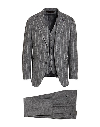 κοστούμι με μονόπετο σακάκι, τσόχα, με ψιλή ρίγα, χωρίς διακοσμητικές λεπτομέρειες, πέτο, μακριά μανίκια, μανσέτες με κουμπιά, φόδρα, κλείσιμο με κουμπιά, κλείσιμο με φερμουάρ, τσεπάκι στο στήθος, τσέπες με καπάκι, δύο σκισίματα πίσω, ψηλόμεσο, σύνολο 3 τεμαχίων, πλύσιμο στο χέρι ή στεγνό καθάρισμα, απαγορεύεται το χλώριο, απαγορεύεται το στέγνωμα σε στεγνωτήριο