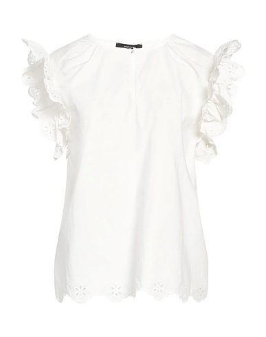 top, woven, lace, solid color, brand logo, crewneck, short sleeves, 1 button, contains non-textile parts of animal origin