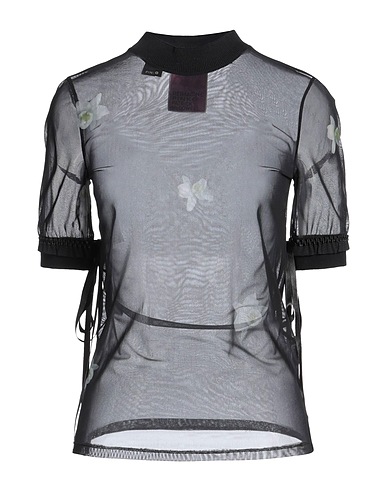 top, tulle, floral-print, gathered, knitted trims, crewneck, short sleeves, unlined, stretch, machine wash, do not bleach, do not tumble dry