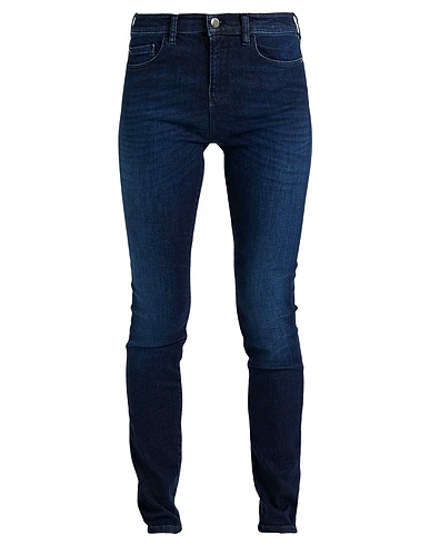 denim, faded, brand logo, solid color, dark wash, mid rise, belt loops, tapered leg, slim-leg pants, 1 button, multipockets, stretch, skinny model