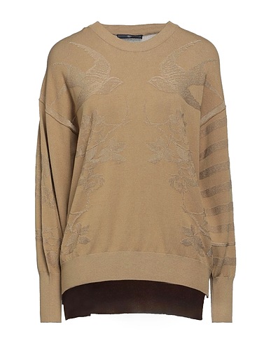 knitted, jacquard, lightweight knit, brand logo, solid color, round collar, long sleeves, no pockets, side slit hemline