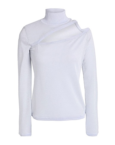 knitted, lightweight knit, metallic, stretchy fabric, cutout, brand logo, solid color, turtleneck, long sleeves, hand wash or dry clean, do not bleach, do not tumble dry