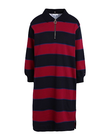 knitted, sweatshirt fleece, brand logo, stripes, polo collar, long sleeves, ribbed cuffs, french terry lining, zipper closure, side slit hemline, lightweight knit, dress
