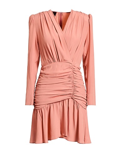 flared dress, crepe, solid color, gathered, deep neckline, long sleeves, shoulder pads, fully lined, zipper fastening, hook fastenings, without pockets, hand wash or dry clean, do not bleach, do not tumble dry