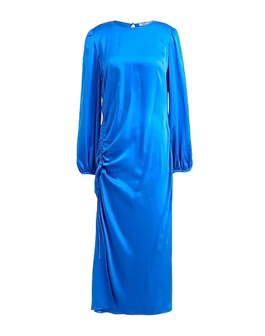 dress, satin, solid color, gathered, crewneck, long sleeves, unlined, 1 button, front slit, dry clean, do not bleach, do not tumble dry