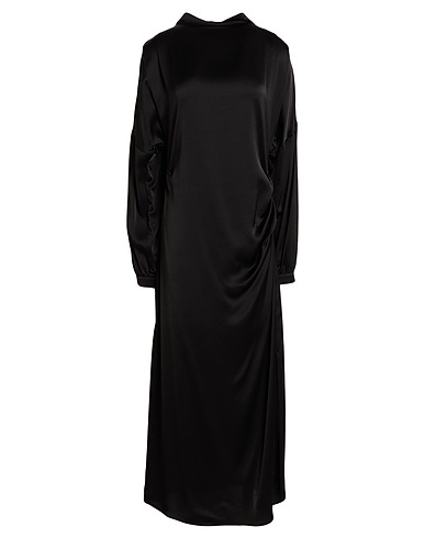 dress, satin, solid color, draped, turtleneck, long sleeves, unlined, zipper fastening, machine wash or dry clean, do not bleach, do not tumble dry