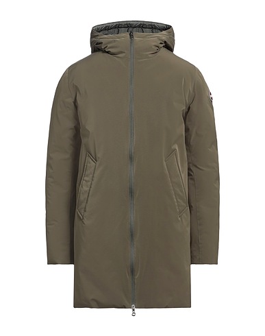 down coat, shell, double face, brand logo, solid color, hooded, long sleeves, duck down filling, heavyweight padding, snap fastenings, slit pockets, contains non-textile parts of animal origin, machine wash or dry clean, do not bleach, tumble dry